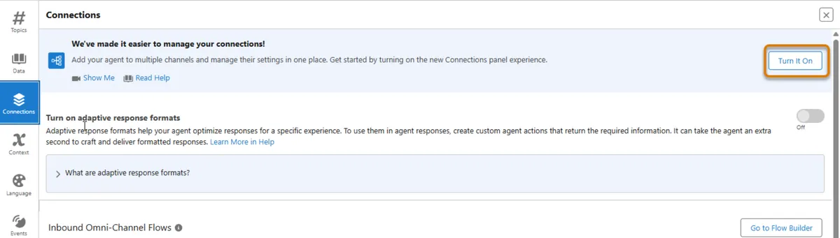 Configure your use case by adding the required Topics and Actions, which determine what the agent can understand and perform.