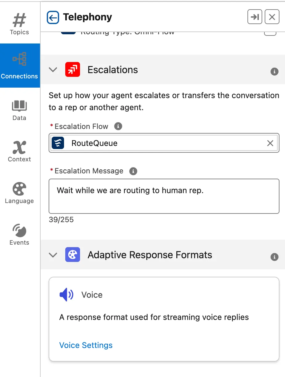 Create a separate Escalation Omni-Channel flow. This is crucial, its role is to disconnect the Agentforce agent so the telephony system regains control to route the call to a human agent.
