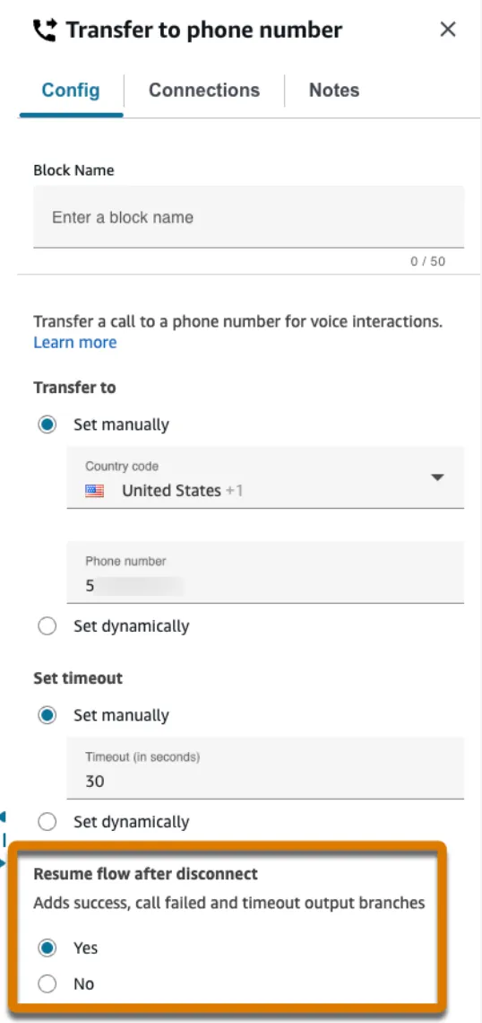 In the Transfer to Phone Number block, enable Resume flow after disconnect.